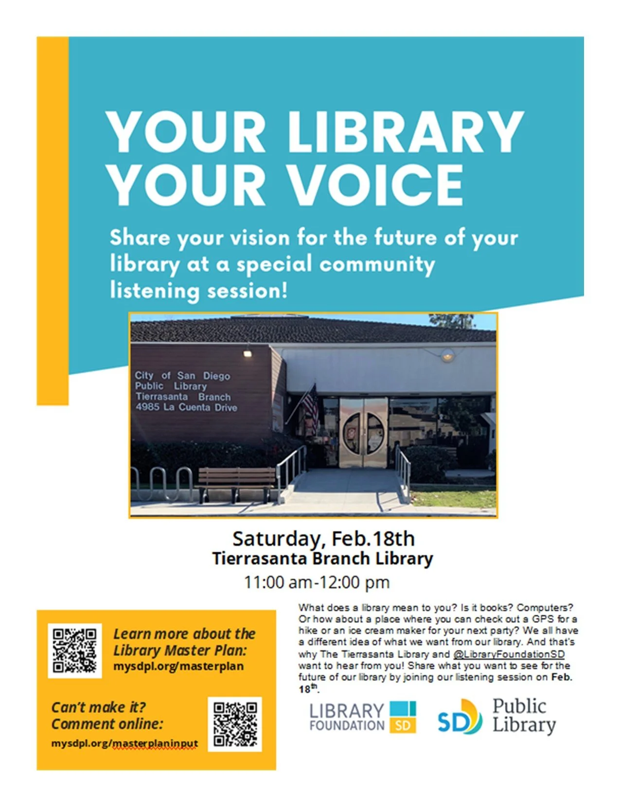 Library Master Plan Listening Session Saturday, February 18, 2023 11:00 AM 12:00 PM Google Calendar ICS